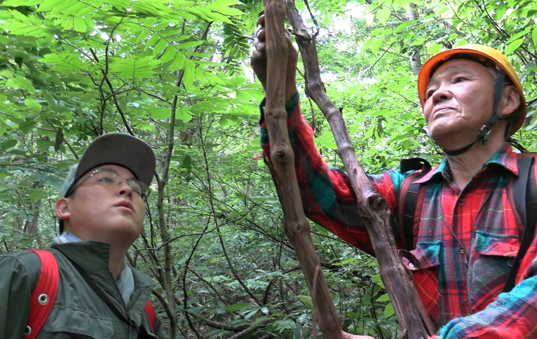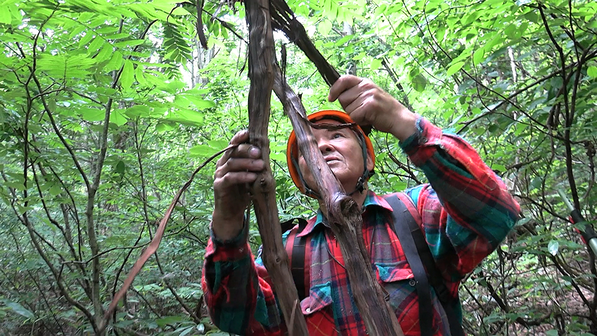 山に入る菅家さんの姿を見てハッとした。提げている袋が、アイヌの編み袋「サラニプ」にそっくりだ。アイヌはシナノキやオヒョウの樹皮で編む。菅家さんは、この編み袋に採取したヤマブドウの樹皮も入れれば、春には山菜、秋にはキノコを入れて、アイヌと同じように使ってきた。ほかにもアイヌとの共通点はあった。