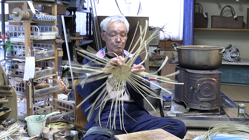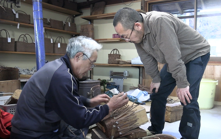 こんな山里で育ったら、人生は、いかばかり違っただろうか。福島県三島町の標高500メートルの集落に住む菅家藤一さんは、昭和28年生まれ。わたしより2歳年長なだけだが、その生活体験と知恵、そして技術は、都会暮らしのわたしからは想像もつかない豊かなものだ。カメラをそれを丹念に追う。 菅家さんは、ヤマブドウやマタタビの蔓で、籠を編んでいる。「奥会津編み組細工」という伝統の手仕事だ。材料を山中に採りに行くところから、編んで籠に仕上げるまで、すべて自分の手で行う。同県の縄文晩期の荒屋敷遺跡からは、1万点もの籠類の遺物が出土しているというから、その歴史は縄文まで遡ることができるはずだ。